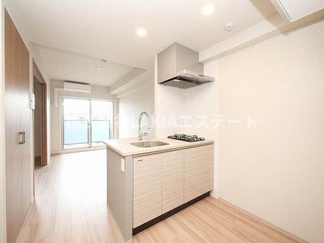 キッチンのご紹介です。カウンターキッチンとなっており、キッチン周りは広々としておりますのでストレスなくご利用いただけます。2口ガスコンロが採用されておりますのでお料理が好きな方にはありがたいですよね。また、シンクも大きく設計されておりますので食器洗いも捗ります。収納スペースが下部にございまして、調理器具や食器を収納していただけますのでとても利便性が高いキッチンとなっております。