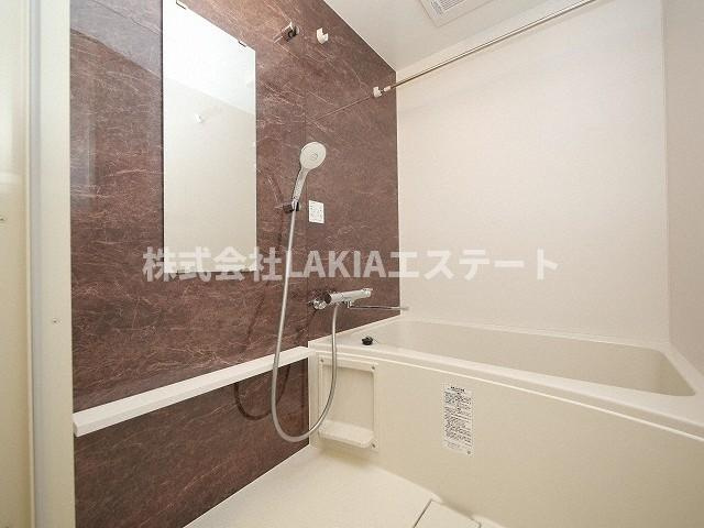 バスルームのご紹介です。バスルームは清潔感があり、ブラウンのアクセントクロスが落ち着いた雰囲気を演出し日々の疲れを癒すのに最適です。浴室乾燥機が完備されており、お風呂に入った後は湿気を効果的に排出するため、いつでも快適で清潔な空間を保つことができます。浴室乾燥機も搭載されている為、雨の日でも効率的に洗濯物を乾かすこともできます。