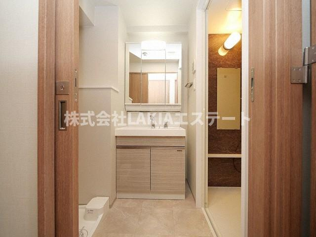 大きい鏡が搭載された3面鏡の独立洗面台となりますので、お出かけ前の準備がスムーズです。さらに、シンク下と鏡裏に収納があり充実しているので化粧水などの化粧品関係や、洗剤や掃除用品などの日用品をたくさんストックしたい方でも脱衣所の収納スペースに困る事はありません。洗濯機置き場も洗面所内にございますが空間が広いため圧迫感を感じることはありません。家事の動線を考えて設計されているので、洗濯物をスムーズに済ませることが出来ます。