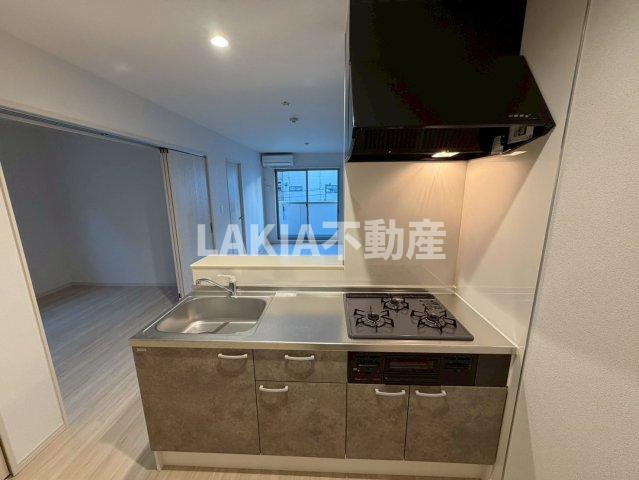 キッチンのご紹介です。キッチン周りは広々としておりますのでストレスなくご利用いただけます。グリル付き3口ガスコンロが採用されておりますのでお料理が好きな方にはありがたいですよね。また、シンクも大きく設計されておりますので食器洗いも捗ります。収納スペースが下部にございまして、調理器具や食器を収納していただけますのでとても利便性が高いキッチンとなっております。