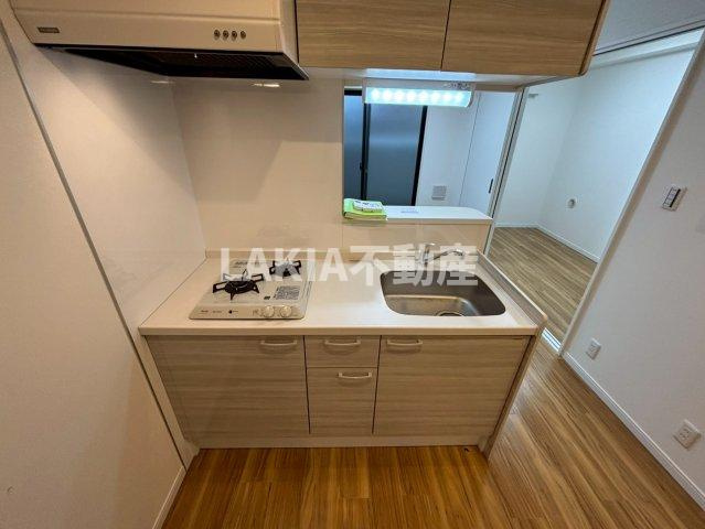 キッチンのご紹介です。キッチン周りは広々としておりますのでストレスなくご利用いただけます。2口ガスコンロが採用されておりますのでお料理が好きな方にはありがたいですよね。また、シンクも大きく設計されておりますので食器洗いも捗ります。収納スペースが下部にございまして、調理器具や食器を収納していただけますのでとても利便性が高いキッチンとなっております。