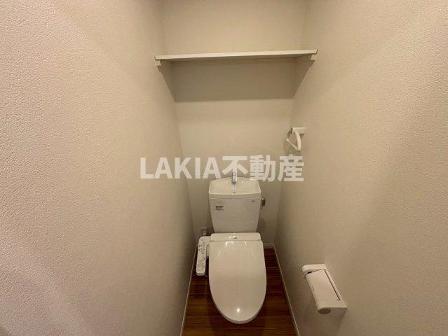トイレのご紹介です。温水洗浄便座(ウォシュレット)が完備されておりますので、寒い時期でも、座った時に不快感を感じることなく快適にトイレをお使いいただけます。真っ白な清潔感のある空間となっております。トイレ上部には収納がございますので、生活感を感じさせることなく、トイレットペーパーなどのトイレ用品や掃除用具を収納していただけます。
