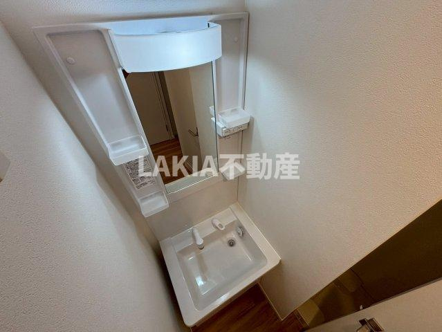 大きい鏡が搭載された独立洗面台となりますので、お出かけ前の準備がスムーズです。さらに、シンク下と鏡横に収納があり充実しているので化粧水などの化粧品関係や、洗剤や掃除用品などの日用品をたくさんストックしたい方でも脱衣所の収納スペースに困る事はありません。洗濯機置き場も洗面所内にございますが空間が広いため圧迫感を感じることはありません。家事の動線を考えて設計されているので、洗濯物をスムーズに済ませることが出来ます。