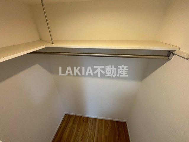 収納のご紹介です。ウォークインクローゼットとなっております。収納力がありハンガーラックがついておりますので、お洋服をたくさんお持ちの方でもしわがつくことなく十分に収納していただけます。奥行きがございますので大きなものや収納ボックスなど置く事も可能です。